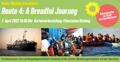 Die Gilchinger Grünen laden in Zusammenarbeit mit der Filmstation Gilching am 7.4. zu einer Filmdiskussion ein. Im Mittelpunkt steht die Dokumentation "Route 4" zum Themenkreis Flucht und Seenotrettung. Zu Gast ist Andreas Krahl, der für die Grünen im Landtag arbeitet und Crewmitglied auf dem Seenotrettungsschiff Sea-Eye war. Andreas Krahl ist bereits ab 19 Uhr im Kino-Empfangsbereich und steht nach dem Film, der eine knappe Stunde dauert, als Gesprächspartner im Kinosaal zur Verfügung.