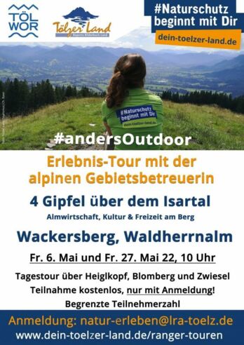Bergtour über den Heiglkopf und Blomberg bis zum Zwiesel: Über Almwiesen und durch Bergwald geht es auf den Heiglkopf. Der Blomberg vereint auf gelungene Weise touristisches Angebot, Kultur und Natur. Almwirtschaft prägt hingegen den Zwiesel. Durch einen schönen Bergwald steigen wir ab zum Ausgangspunkt, der WaldherrAlm Wackersberg. Tagestour von 6 bis 7 Stunden und mit 700 Höhenmetern.