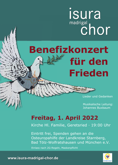 Der Isura Madrigal Chor Geretsried lädt zu einem Benefizkonzert für den Frieden ein. Mit Liedern, Texten und Gebeten zum Thema Krieg und Frieden soll ein Zeichen der Solidarität mit den Opfern von Krieg und Gewalt gesetzt werden. Die eingenommenen Spenden gehen an die Osteuropahilfe der Landkreise Starnberg, Bad Tölz-Wolfratshausen und München e.V.