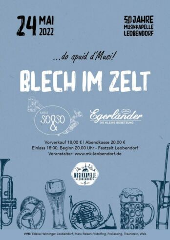 Die Kapelle "So&So" und die Kapelle "Die kleine Egerländer Besetzung - Das Original" spielen im Leobendorfer Festzelt. Karten gibt es bei Edeka Helminger in Leobendorf, im Reisebüro Marx in Fridolfing, Traunstein, Freilassing und in Wals, sowie über die Vereinsmitglieder persönlich. Einritt 18,- Euro im Vorverkauf und an der Abenkasse 20,- Euro.