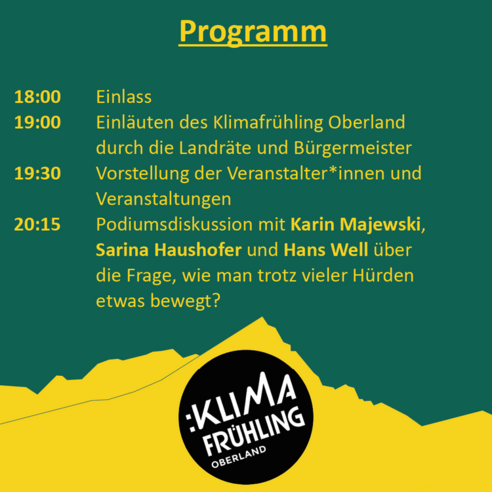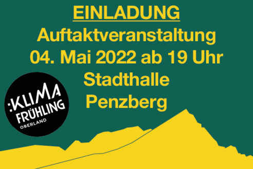 Wir laden Sie recht herzlich ein dabei zu sein, wenn wir zusammen mit den Bürgermeistern und Landräten den Klimafrühling Oberland 2022 einläuten. Damit startet ein dreiwöchiges Programm voller Vorträge, Workshops, Onlineveranstaltungen, Filmvorführungen, Ausstellungen und vielem mehr rund um das Thema Klimaschutz.