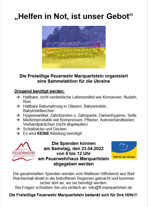 Die Freiwillige Feuerwehr Marquartstein organisiert eine Sammelaktion für die Ukraine.