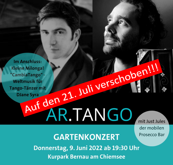Achtung: Das Gartenkonzert wird auf Grund der Witterung auf den 21. Juli 2022 verschoben. Bereits erworbene Tickets behalten selbstverständlich auch für den neuen Termin ihre Gültigkeit bzw. können an der jeweiligen Vorverkaufsstelle rückerstattet werden.  AR.TANGO: Sebastian Rodriguez (Piano, Komposition) und Facundo Barreyra, (Bandoneón, Perkussion und Komposition)Im vergangenen Sommer fanden die „Gartenkonzerte by Anna Rehker“ erstmals mit drei gut besuchten Konzerten an lauen Sommerabenden in Bernau am Chiemsee statt. Auch in diesem Jahr ist der Musikpavillon im Kurpark wieder Bühne für temperamentvolle Musik unter freiem Himmel. Den Startschuss für die diesjährige Konzertreihe gibt das Ensemble AR.TANGO am Donnerstag, den 21.07. um 19:30 Uhr.Das argentinische Duo bringt mit ihrem Auftritt ein Stück südamerikanische Lebensfreude und Leidenschaft in den Bernauer Kurpark. Die beiden Musiker Sebastian Rodriguez (Piano) und Facundo Barreyra (Bandoneón und Stimme) haben sich auf einer Kreuzfahrt durch Südamerika kennengelernt, auf Anhieb zusammen musiziert und das Duo noch an Bord gegründet. AR.TANGO spielt Musik von Astor Piazzolla und begeistert mit einem Arrangement traditioneller Tangos, Milongas und Walzer, aber auch argentinischer Volksmusik und eigenen Kompositionen.Im Anschluss an das Konzert findet noch eine kleine Milonga statt. Fans von Tango und südamerikanischen Klängen können noch zum Tanz bleiben – musikalisch begleitet von DJane Syra. Just Jules, die mobile Prosecco Bar aus Übersee, begleitet den Abend mit spritzigen Erfrischungen.Wann: Donnerstag 21. Juli 2022, Einlass um 19 Uhr, Konzertbeginn um 19.30 Uhr