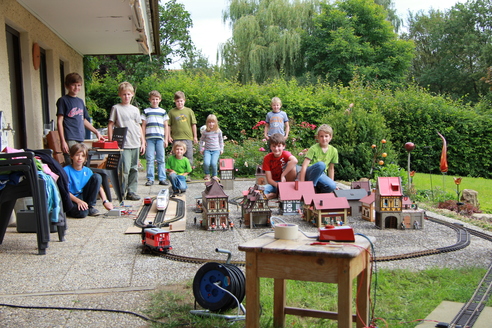 Herr Hohmann wird mit Euch in seinem Garten eine Eisenbahn aufbauen und anschließend betreiben.