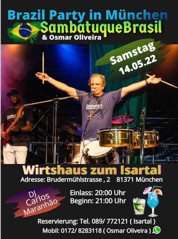 Sambatuque Brasil, seit drei Jahrzehnten eine der größten, ältesten und erfolgreichsten Samba-Gruppen außerhalb Brasiliens, kehrt mit besten Erinnerungen an den Ausgangsort ihrer außergewöhnlichen Karriere zurück: ins Wirtshaus zum Isartal. Am 14.05.2022 lädt Bandleader Osmar Oliveira alle Freunde südamerikanischer Rhythmen zu einer heißen Nacht mit Samba, Salsa, Shows und Caipirinha ein. Sie erwartet ein atemberaubendes Live Party – mit feinen brasilianischen Köstlichkeiten und tropischen Cocktails. Osmar Oliveira: „Wer vorher schon ein paar Kostproben von unserer Musik hören und sehen will, sollte einfach unseren YouTube-Kanal „Sambatuque Brasil Official“ anklicken.