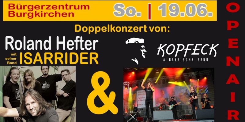 Roland Hefter mit ISARRIDERGeschichten in Liedern, direkt aus dem Leben, voller positiver Energie und bayrischer Lässigkeit, umgesetzt in klassicher Rock’n’Roll Besetzung mit zwei Gitarren (Roland Hefter / Wolfi Hierl), Bass (Erich Kogler), Schlagzeug (Babs Margeth) und Saxophon (Stephan Reiser).Wenn Roland Hefter mit seiner Band auf der Bühne steht, möchte man meinen, er sei da schon geboren und aufgewachsen und habe nie was anderes in der Hand gehabt als seine Gitarre, mit deren zeitloser Unterstützung und der perfekt eingespielten Band er davon erzählt, was im Leben passiert und wie das Leben ist. Entwaffnend offen, weil er immer den Punkt trifft und stets die Balance hält zwischen Selbstironie, Witz, Blödsinn und dem ernsten (und manchmal sogar sehr ernsten) Kern, der in vielen Liedern steckt. Weil er genau die richtigen Worte findet, die uns allen manchmal fehlen. Weil er schon mal hinterfotzig, krachert, auch sozialkritisch ist, aber nie zu laut oder gar zornig. Und weil er seine Lieder mit einer derart unwiderstehlichen Leichtigkeit vorträgt, dass spätestens nach einer Minute niemand mehr im Saal ist, der nicht mindestens lächelt oder grinst. Roland Hefter mit seiner Band ISARRIDER sind echt. Echt wie die Liebe zu den Menschen, zum Leben, zur Musik, zum Frohsinn, und einem unverbrüchlicher Optimismus. Dass wir alle nur einmal auf der Welt sind, dass Spaß und Freude wichtiger sind als Geld, – das weiß ja eigentlich jeder. Man vergisst es halt bisweilen, und dann ist es gut, wenn einen jemand daran erinnert. In diesem Fall eine fantastische bayrische Rockband mit einem Frontman, dem man so was abnimmt. Da darf es auch gern mal zweideutig werden und die Grenze zum Derben touchieren, schließlich prägt und trägt all das unser alltägliches Leben; um so besser, wenn jemand ein Lied draus macht. Ein Konzert mit Roland Hefter und seiner Band ist ein urgewaltiges Erlebnis, das musikalisch und inhaltlich in der bayrischen Unterhaltung schwer zu überbieten ist.KOPFECK – Hund san’s scho!Wenn sich eine Band nach dem legendären Kopfeck Manni, dem besten Freund vom Monaco Franze benennt, dann weiß man gleich: Diese Musik kommt ganz tief aus der bayrischen Seele! Die urwüchsige Kraft der bairischen Sprache, dazu die geballte Power moderner Pop- und Rockmusik – das passt zusammen wie Hopfen und Malz und deshalb schmeckt die Musik der Band auch wie eine frische Mass! Die opulente Instrumentierung, die entspannte bayrische Lässigkeit und ein Groove wie eine auffrisierte Zündapp – basst!In seiner bairischen Muttersprache erzählt Songwriter Rudolf Wiesent in seinen Texten erlebte, erträumte oder erdachte Geschichten mit melancholisch-tiefgründiger Poesie und Vieldeutigkeit. Die Themen nimmt er dabei direkt aus dem Leben, so wie es ist und wie es jeder kennt: mal lustig und mal traurig, mal laut und mal leise, mal Ballade mal Rock’n’Roll, das große Glück in den Händen und die Tücken des Alltags im Nacken, mal ganz weit unten und dann wieder himmelhoch! Und das absolut aufrichtig und unverfälscht, heimatverbunden, romantisch, philosophisch, oft entwaffnend komisch und gerne auch politisch unkorrekt – bayrisch halt! Dabei beherrscht er auch die Zwischentöne, in denen er immer eine große Portion Menschenfreundlichkeit und Liebe sowie eine tiefe Lebensfreude durchblicken lässt. Die Musik dazu bewegt sich zwischen Pop und Rock mit markanten Ausreißern in Country, Blues, Reggae, Funk und Weltmusik - aber immer ehrlich und handgemacht. Ein unverwechselbarer Sound, wie er eigentlich nur aus Bayern kommen kann.KOPFECK: Das sind Rudolf Wiesent (Gesang), Alexander Sax (Bass), Toni Kastner (Schlagzeug), Michi Dörr (Keyboard), Heinz Peters (Saxophon, Percussion), Michael Verwagner (Leadgitarre) und Multi-Instrumentalist Marino Schuhmacher (E-Gitarre, Akustikgitarre, Mandoline, Sitar, Harp, Keyboard etc.).