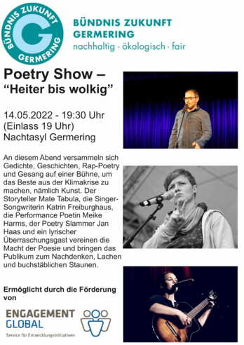 An diesem Abend versammeln sich Gedichte, Geschichten, Rap-Poetry und Gesang auf einer Bühne, um das Beste aus der Klimakrise zu machen, nämlich Kunst. Der Storyteller Mate Tabula, die Singer-Songwriterin Katrin Freiburghaus, die Performance Poetin Meike Harms, der Poetry Slammer Jan Haas und ein lyrischer Überraschungsgast vereinen die Macht der Poesie und bringen das Publikum zum Nachdenken, Lachen und buchstäblichen Staunen.