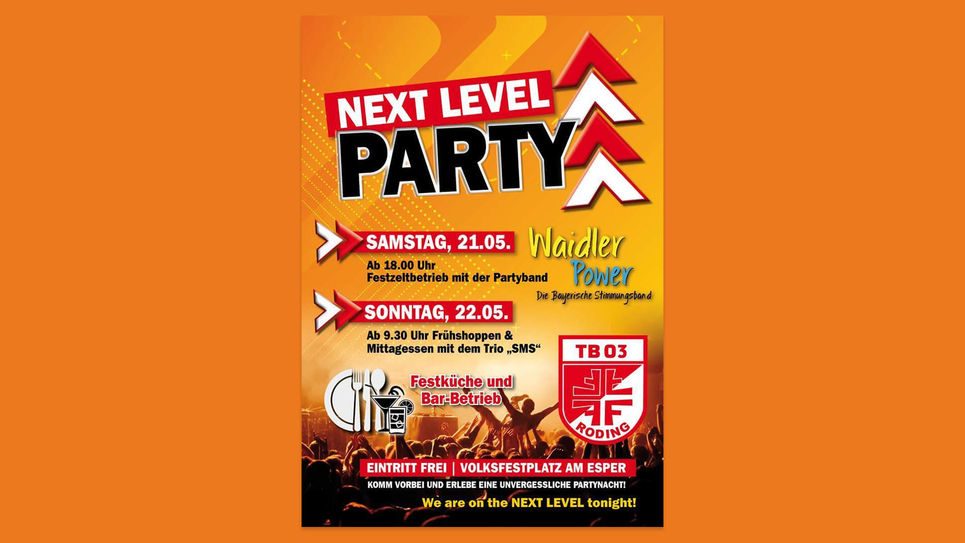NEXT LEVEL PARTYKomm vorbei und erlebe eine unvergessliche Partynacht!Samstag, 21.05. Festzeltbetrieb mit der Partyband Waidler PowerSonntag, 22.05. Frühschoppen & Mittagessen mit dem Trio "SMS"