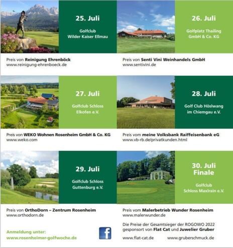 Die Rosenheimer Golfwoche ist zu einer Top-Veranstaltung in der Region Rosenheim geworden.Natürlich steht der sportliche Wettbewerb im Vordergrund, aber es sind nicht zu letzt die vielen persönlichen Begegnungen, die mir an dieser Sportveranstaltung so besonders gut gefallen. Mit der ROGOWO wollen wir den regionalen Tourismus stärken, mit all seiner schönen Umgebung, die unsere Region zu bieten hat. Jährlich über 500 Teilnehmer aus mittlerweile über 60 verschiedenen Golfclubs bestätigen die Qualität dieser Golfserie, die damit zu den Teilnehmerstärksten in Süddeutschland zählt.Heuer präsentieren wir mit dem Golfplatz Thailing und dem Golfclub Schloß Elkofen wieder zwei neue Golfclubs in unserer Turnierserie. Ein herzliches Dankeschön an dieser Stelle allen Sponsoren und ausrichtenden Golfclubs, die diese Turnierserie nachhaltig unterstützen.Der im Vorjahr etablierte Charity Gedanke soll 2022 weiter fortgesetzt werden, so dass wir gemeinschaftlich wieder für wohltätige Zwecke in der Region spenden können.Die Rosenheimer Golfwoche sollte auch zu einem festen Bestandteil Ihrer persönlichen Terminplanung werden.Wir wünschen Ihnen viel Spaß und vor allem eine erfolgreiche Golf-Saison! Hier geht´s zur Anmeldung: Wirtschaftlicher Verband Rosenheim - Anmeldung (wirtschaftlicher-verband.de)