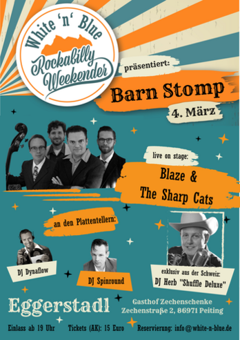 Im Eggerstadl des Gasthofs Zechenschenke findet der Barn Stomp am 04. März statt. Einlass ist ab 19 Uhr.Reservierung und Info unter: https://www.white-n-blue.de/