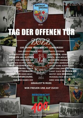 Beim Tag der offenen Tür 2022 in der Bergrettungswache an der Karwendelstraße lädt die Bergwacht Lenggries zu ihrem 100. Geburtstag ein! Neben Herzhaftem vom Grill und Süßem vom Kuchenbuffet, darf natürlich ordentlich angestoßen werden. Bei gutem Wetter gibt’s für die Kleinen eine Hüpfburg, aber auch die Größeren und ganz Großen dürfen den Kletterbaum erklimmen oder sich im Gebirgstragenparcours beweisen. Wer mag, lässt sich Wunden anschminken oder begibt sich auf eine Reise in die Historie der Naturschutzarbeit und Notfallrettung der Bergwachtfrauen und -männer im Isarwinkel. Und während es Einiges zur Geschichte der Bereitschaft zu entdecken geben wird, darf auch der Blick in die Zukunft und den Plänen sowie dem Stand der Dinge zur neuen Wache nicht fehlen … Musikalisch begleitet wird das Programm von der “Grasleit’n Musi”.