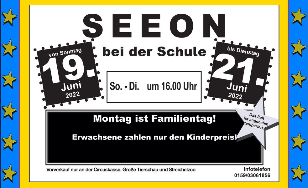Große Tierschau und Streichelzoo. Infotelefon: 0159/03061856. Am Montag ist Familientag: Erwachsene zahlen nur den Kinderpreis. Vorverkauf an der Circuskasse.