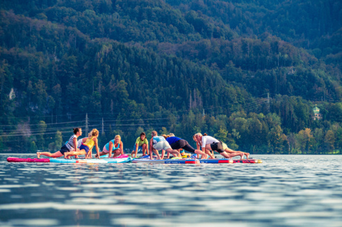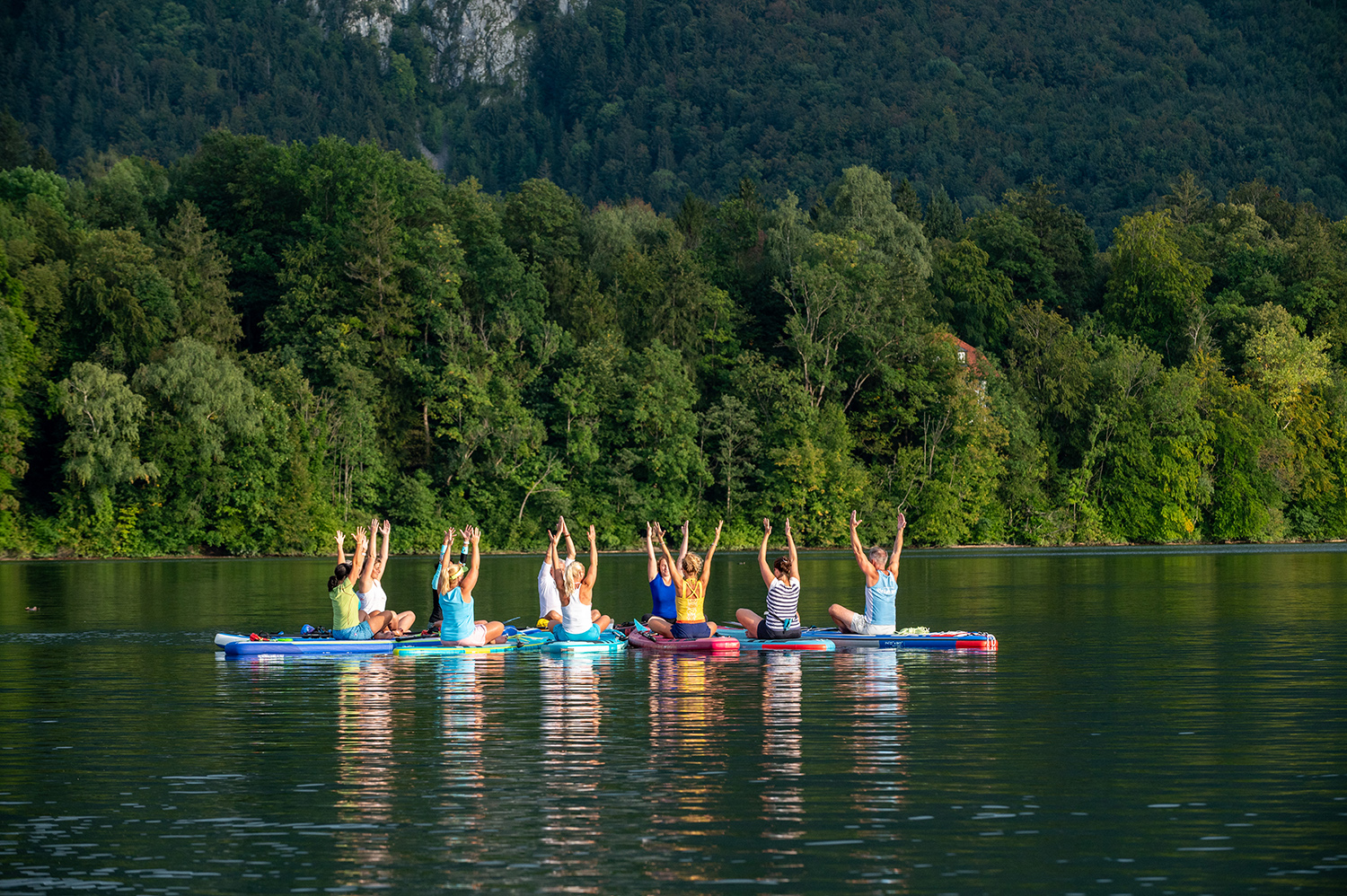 Beim SUP Yoga wird das Board zur schwimmenden Yogamatte. Die Yogaübungen und kurzen Meditationen wirken intensiver und sind doch für Jede/n leicht auszuführen. Es geht vor allem auch um eine ganz besondere Erfahrung im Einklang mit sich und der Natur.