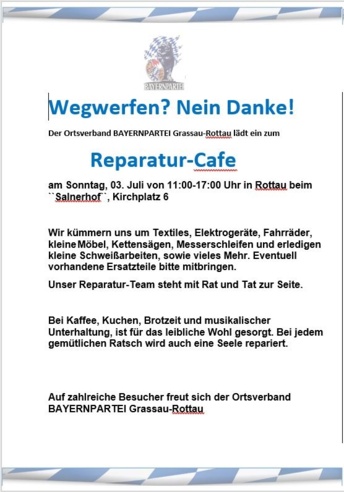 Hier werden kostenlos Reparaturen durchgeführt. Wir kümmern uns um Textiles, Elektrogeräte, Fahrräder, kleine Möbel, Kettensägen, Messer schleifen und erledigen kleine Schweißarbeiten, sowie vieles mehr. Eventuell vorhandene Ersatzteile bitte mit bringen. Unser Reparatur Team steht mit Rat und Tat zur Seite. Veranstalter: Bayernpartei OV Grassau-Rottau.