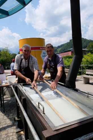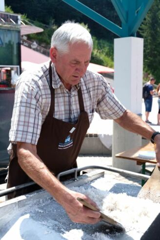 Im Juli und August sind vor dem Salzbergwerk Berchtesgaden wieder die Salzsieder. Sie bauen ihre Sudpfannen auf, verdampfen die Sole und zeigen den Gästen somit, wie aus Sole Salz gemacht wird.