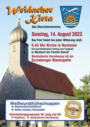 De Weidacher Madl und Burschn laden eich endlich wieder zu unserm Kirta am 14. August 2022 bei da Familie Baindl ei.