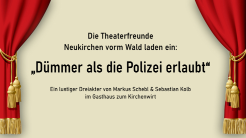 Die Theaterfreunde Neukirchen vorm Wald spielen den lustigen Dreiakter "Dümmer als die Polizei erlaubt" Ein Stück von Markus Schebl & Sebastian Kolb (Wilhelm Köhler Verlag)Einlass Sonntag ab 9.30 Uhr.Möglichkeit für ein Weißwurstfrühstück!Bitte reservieren Sie rechtzeitig Ihren Platz unter Tel. 08504-2605Einlass nach den zu diesem Termin geltenden Corona-Regeln!