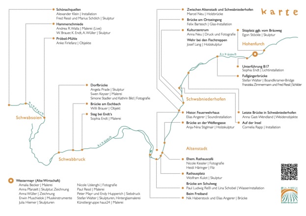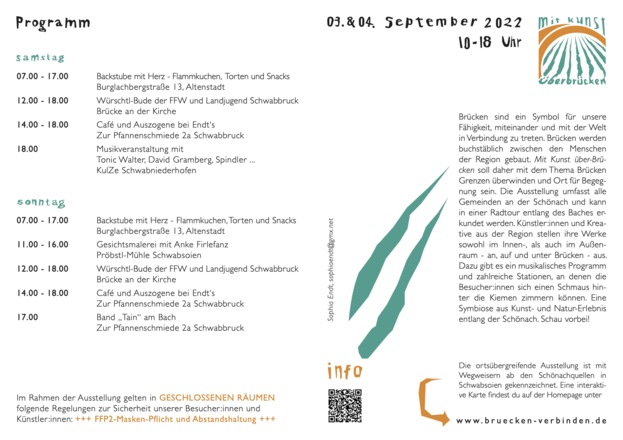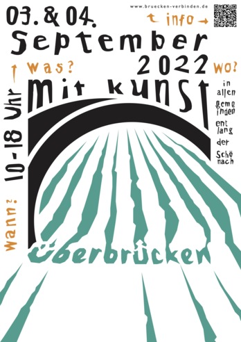 Die Ausstellung „mit Kunst über-Brücken“ umfasst alle Gemeinden an der Schönach und kann in einer Radtour entlang des Baches erkundet werden. Künstler:innen und Kreative aus der Region stellen ihre Werke sowohl im Innen-, als auch im Außenraum - an, auf und unter Brücken - aus. Dazu gibt es ein musikalisches Programm und zahlreiche Stationen, an denen die Besucher:innen sich einen Schmaus hinter die Kiemen zimmern können. Eine Symbiose aus Kunst- und Natur-Erlebnis entlang der Schönach.