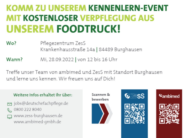 Pflegejob in Burghausen gesucht? Das ambimed und Pflegezentrum ZesS suchen Verstärkung 💪 Komm zu unserem Kennenlern-Event mit kostenloser Verpflegung aus unserem Foodtruck!