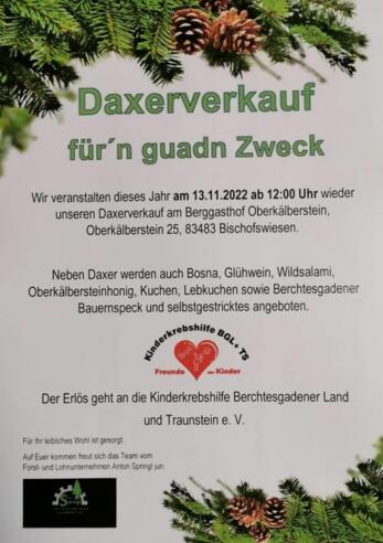 Das Forst- und Lohnunternehmen Springl veranstaltet am 13. November 2022 ab 12:00 Uhr wieder den Daxerverkauf am Berggasthof Oberkälberstein.
