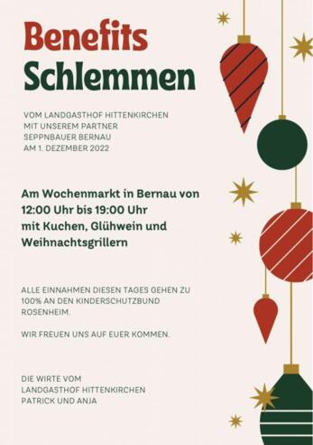 Benefits Schlemmen vom Landgasthof Hittenkirchen mit seinem Partner Seppnbauer am 1. Dezember 2022.Am Wochenmarkt in Bernau von 12-19 Uhr mit Kuchen, Glühwein und Weihnachtsgrillern.Alle Einnahmen diesen Tages gehen zu 100 % an den Kinderschutzbund Rosenheim