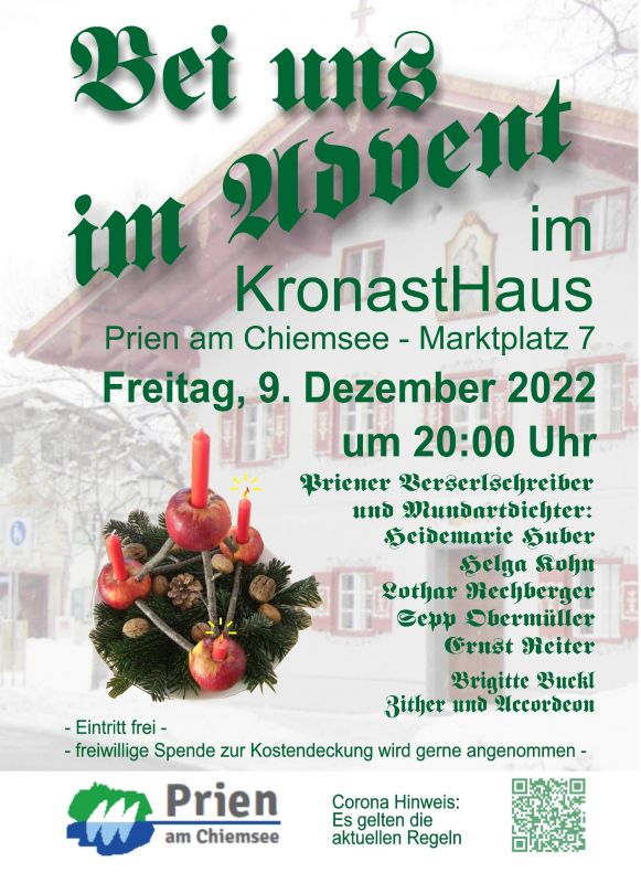 Wir, die Priener Verserlschreiber, wollen es wagen und starten wieder, nach der Corona Pandemie, mit einer vorweihnachtlichen Veranstaltung. Die Sicherheitsmaßnahmen, Corona bedingt, lassen es leider nicht zu, dass wir Priener Verserlschreiber den Advent-Hoagascht, „Bei uns im Advent“, traditionell im liebgewordenen Priener heimatMuseum abhalten.