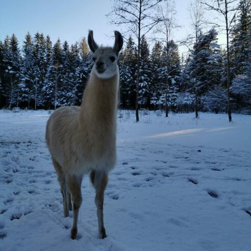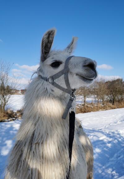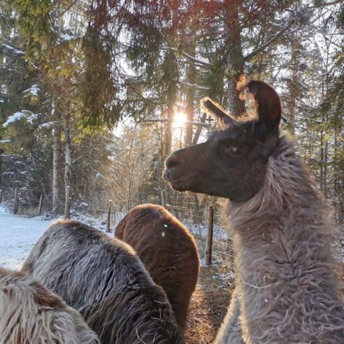 Wir erleben den Winterzauber bei einer gemeinsamen einstündigen Lamawanderung durch die Ascholdinger Winterlandschaft.