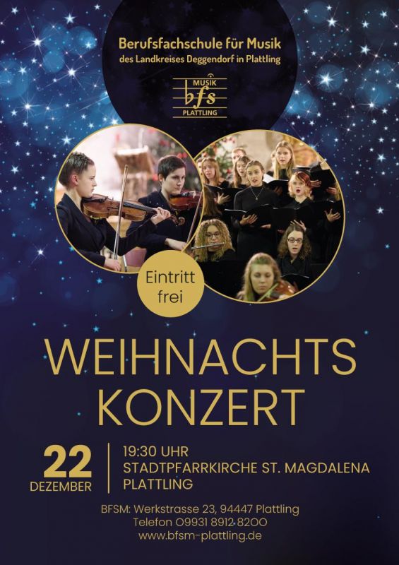 Die Berufsfachschule für Musik des Landkreises Deggendorf lädt herzlich zum Weihnachtskonzert in der Stadtpfarrkirche St. Magdalena in Plattling ein. Termin: Donnerstag, 22. Dezember 2022, 19:30 UhrEintritt frei.