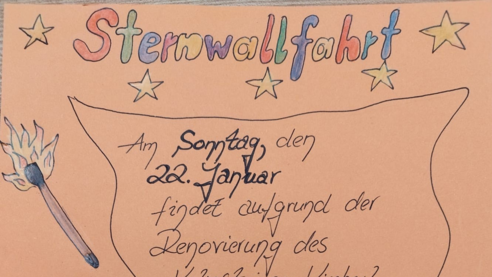 Abmarsch um 16 Uhrfür Haibühl: Niggl Kapellefür Hohenwarth: Parkplatz HöllhöheAndacht im Kolmsteiner Kircherl um 16:30 UhrAufgrund der Renovierung des Kolmsteiner Kircherl Sternwallfahrt als Winterwanderung.Bitte Fackeln, Taschenlampen oder Laternen mitbringen!