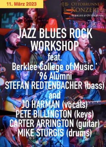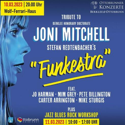 Unter der Leitung des Berklee ‘95 Alumni Stefan Redtenbacher, UK.Samstag, 11. März 2023: Jazz, Blues, Rock WorkshopsDiese JONI MITCHELL SHOW präsentiert eine Weltklasse-Band internationaler Musiker, die unter anderem in den Bands von David Bowie oder Stevie Winwood spielen. Bandleader Stefan Redtenbacher hat FUNKESTRA mit einigen der bekanntesten Studio- und Livemusikern der britischen Szene zusammengestellt. Die Show wird durch die Sänger MIM GREY, bekannt durch seine Zusammenarbeit mit Paul Mc Cartney, Tom Jones und Dave Stewart und JO HARMAN, der u.a. mit Michael McDonald und Joan Baez zusammengearbietet hat stimmgewaltig ergänzt. Joni Mitchell wurde im Jahre 2022 die Ehrendoktowürde des BERKLEE COLLEGE OF MUSIC in Boston verliehen. Ihre Lieder und Musik haben den Elfenbeinturm der Musikgeschichte erreicht. An diesem Abend wird die Musik von Joni Mitchell in neuem Licht erblühen.Eintrittspreis: € 19,00 (ermäßigt € 12,00)Besetzung: