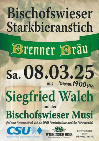 Auch in diesem Jahr findet wieder der traditionelle Bischofswieser Starkbieranstich im Gasthof Brenner Bräu statt.