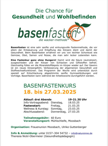 Basenfastenwoche vom 7. bis 17. MärzTeilnahmegebühr 60 EuroDozentin: Theresia Nickl-Obermeier, Gesundheitspädagogin und BasenfastenberaterinAnmeldung unter Tel.Nr. 0172 9436076 oder E-Mail: u.guttenberger@elektro-guttenberger.de
