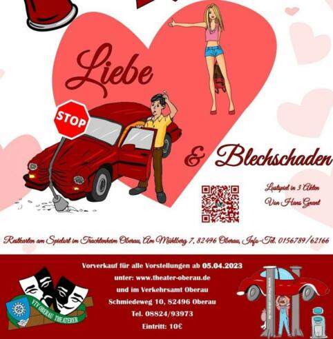 Die Hinterleitners streiten sich immer wieder um ihr Auto. Toni ist der Experte und seine Frau hat davon selbstverständlich gar keine Ahnung. Doch dann hat er einen peinlichen Unfall und das Chaos ist programmiert.Vorverkauf der Theaterkarten ab 05.04.2023 in der Tourist-Information Oberau oder online unter www.theater-oberau.de