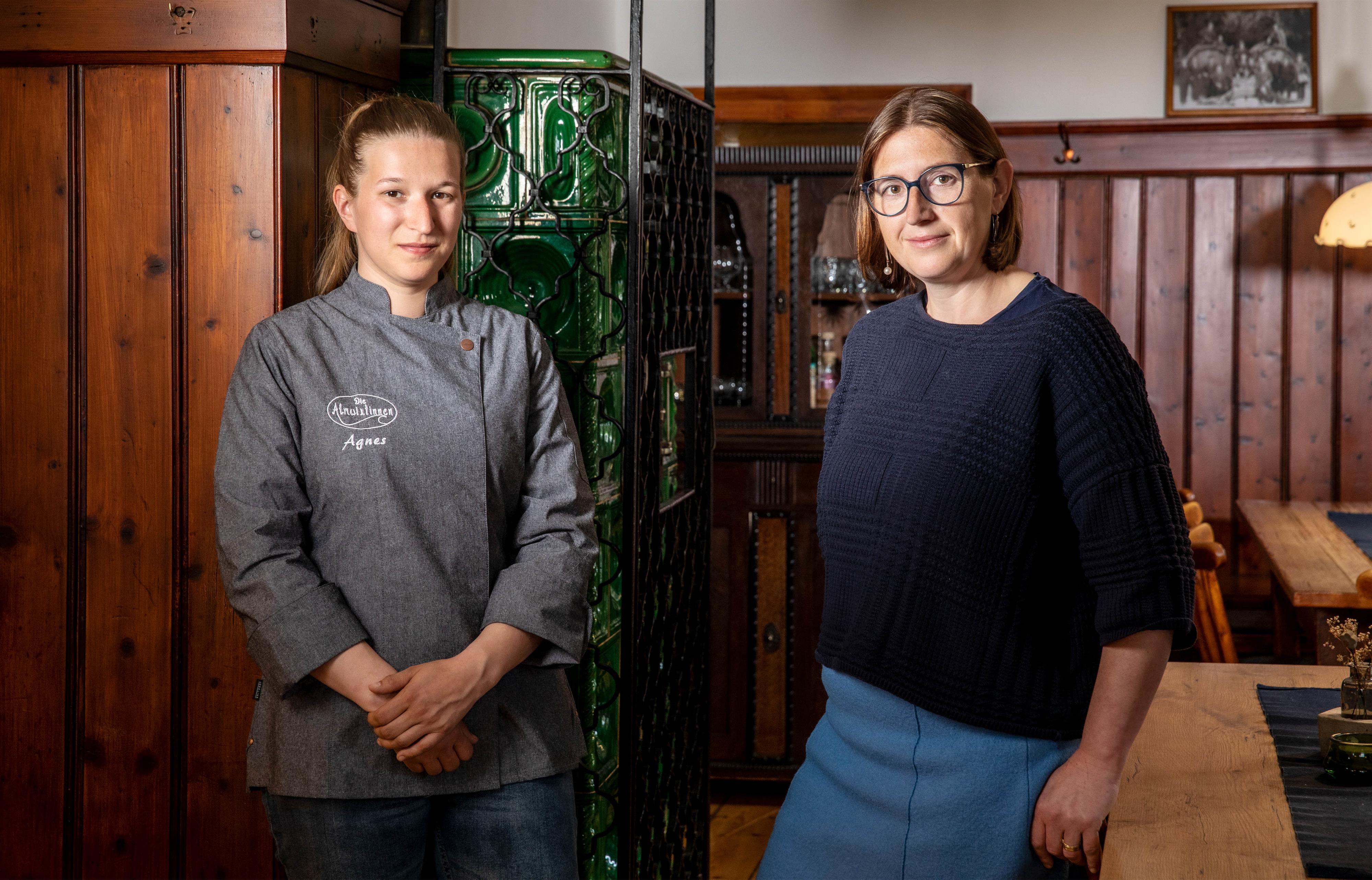 Dazu servieren die Almwirtinnen Michaela Ettinger und Agnes Holzinger ein 7-Gang-Menü ihrer raffinierten Wirtshausküche. Das schon kultige Bratl-Carpaccio gibt’s ebenso wie die Brennnesselschaumsuppe mit Forellennockerl, die geschmorten Kalbsbackerl mit Erdäpfelbuchteln und natürlich die berühmten, süßen Kasnudeln.