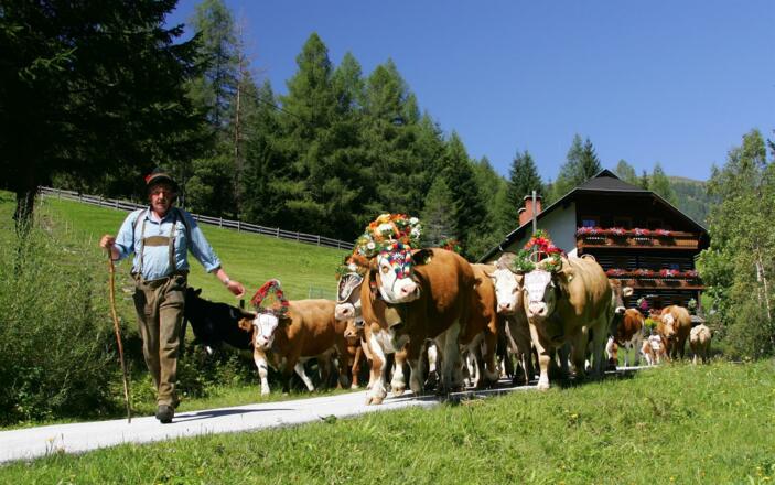 der Kühe beim Gasthof Hinteregger in St. Oswald und Abmarsch nach Bad Kleinkirchheim.