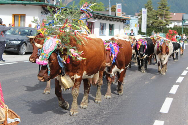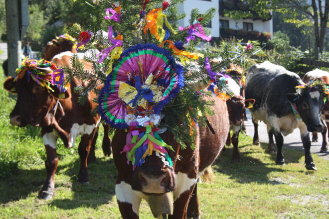 Zwischen 13.00 und 14.00 Uhr werden die geschmückten Almkühe im Tal erwartet und anschließend direkt neben dem Festgelände weiden.