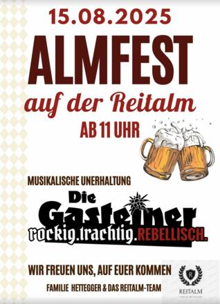 Besuchen Sie das Almfest auf der Reitalm. Für musikalische Unterhaltung sorgen das "Original Kuhmuglduo" und ab ca. 15.00 Uhr "Die Gasteiner". Regionale Schmankerl und verschiedene Köstlichkeiten dürfen auf dem Fest natürlich nicht fehlen. Für die Kinder gibt es einen Abenteuerspielplatz und einen Streichelzoo zu entdecken. Es fährt ab 11.00 Uhr ein Shuttle-Taxi vom Parkplatz Abzweigung Reitalmweg in Hüttschlag, dieses kostet € 5,00 pro Person.
