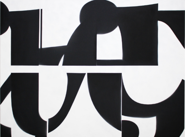 Ihre Ausstellung „Asemic Works“ zeigt insbesondere zwei Blöcke neuer, schwarz-weisser Arbeiten in Acryl auf Leinwand, für die die Künstlerin Schablonen früherer Wand- und Boden-Installationen im Format arrangiert und abgebildet hat. Diese Formen wirken wie Schatten flacher Skulpturen und scheinen Elemente eines unbekannten Schriftsystems zu sein.