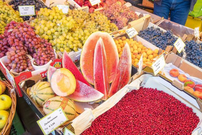 In den beiden Hallen des Benediktinermarktes kann man auch von Montag bis Freitag von 6.30 Uhr bis 16 Uhr (Mittwoch bis 13.45 Uhr) flanieren und durch die gastronomischen Köstlichkeiten gustieren.