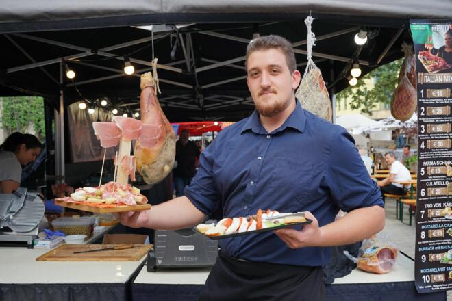 Das Bella Italia bietet mit seinen italienischen Produkten wie Salami, Prosciutto, Käse und Wein wieder kulinarische Köstlichkeiten am Veranstaltungsplatz in der Mattersburger Innenstadt.