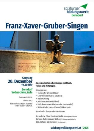 Das Berndorfer Franz-Xaver-Gruber Singen findet heuer am 20.12.2025 um 19:30 Uhr in der Aula der Volksschule Berndorf statt.