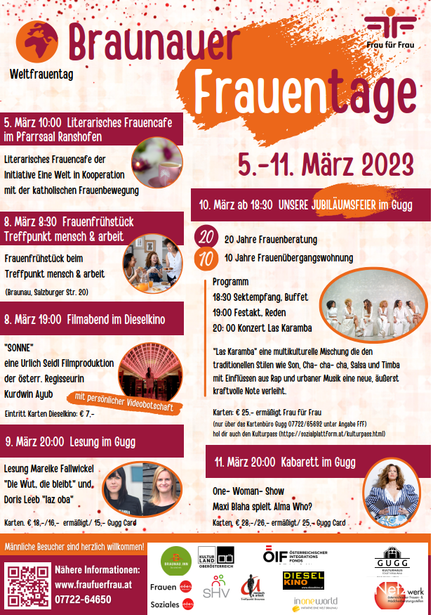 Der Höhepunkt der Braunauer Frauentag findet ebenfalls im Gugg Braunau statt: Die Jubiläumsfeier von Frau für Frau – 20 Jahre Frauenberatung und 10 Jahre Frauenübergangswohnung – beginnt am 10. März 2023 um 18:30 Uhr mit einem Sektempfang mit Buffet. Nach dem Festakt klingt dann die Veranstaltung mit Livemusik von der Band “Las Karamba” gemütlich aus. Tickets für die Jubiläumsfeier erhalten Sie auf www.gugg.at: 28,- Euro | ermäßigt 26,- Euro | Gugg-Card 25,- Euro | ermäßigt für Frau für Frau 25,- Euro nur über das Kartenbüro unter Angabe Frau für Frau