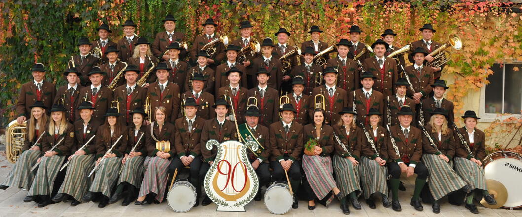 Die Tracht der Musikanten besteht aus einem schwarzen Hut mit Dachsbart, braunem Uniform Rock, roten Leib, schwarzer Kniebundhose mit grünen Stutzen.