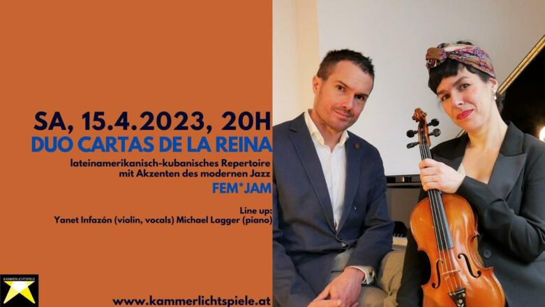 Das Duo „Cartas de la Reina“, bestehend aus der kubanischen Geigerin/Sängerin Yanet Infanzón und dem österreichischen Pianisten Michael Lagger bietet ein lateinamerikanisch-kubanisches Repertoire mit Akzenten des modernen Jazz.