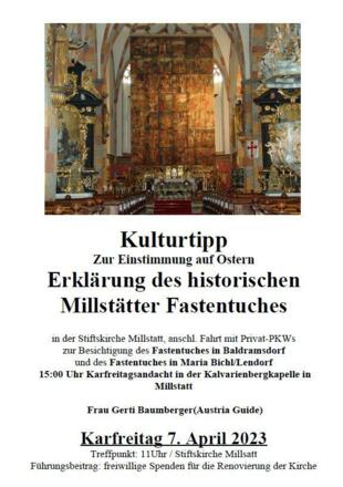 Treffunkt um 11:00 Uhr bei der Stiftskirche Millstatt am See. Erklärung des historischen Millstätter Fastentuches, anschließend Fahrt mit Privat-PKWs zur Besichtigung der Fastentücher in Baldramsdorf und Maria Bichl/Lendorf durch die staatl. gepr. Fremdenführerin, Frau Gerti Baumberger (Austria Guide). Um 15:00 Uhr Karfreitagsandacht mit Provisor P. Slawomir Czulak SCJ bei der Kalvarienbergkapelle in Millstatt.