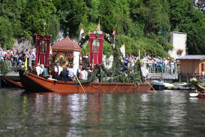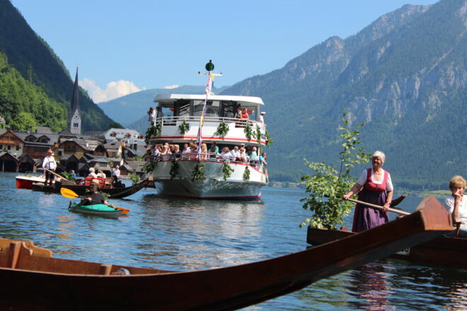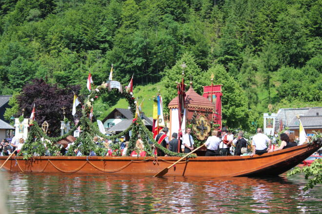 Wenn in Hallstatt sämtliche Bewohner des Ortes ihre „Fuhren“, die traditionellen Boote am See, mit Laub und Blumen schmücken und der gesamte Ort das Festtagskleid anlegt, dann ist Fronleichnam. Die Jesuiten haben die prachtvolle Prozession einst in Hallstatt eingeführt. Weil der kleine Salinenort so wenig Platz an Land hatte, wurde die Prozession einst mit Booten und Salzschiffen auf den See verlegt, nicht zuletzt auch um einen Blick auf den Salzberg, die jahrtausendealte Arbeitsstätte der Hallstätter, zu bekommen.