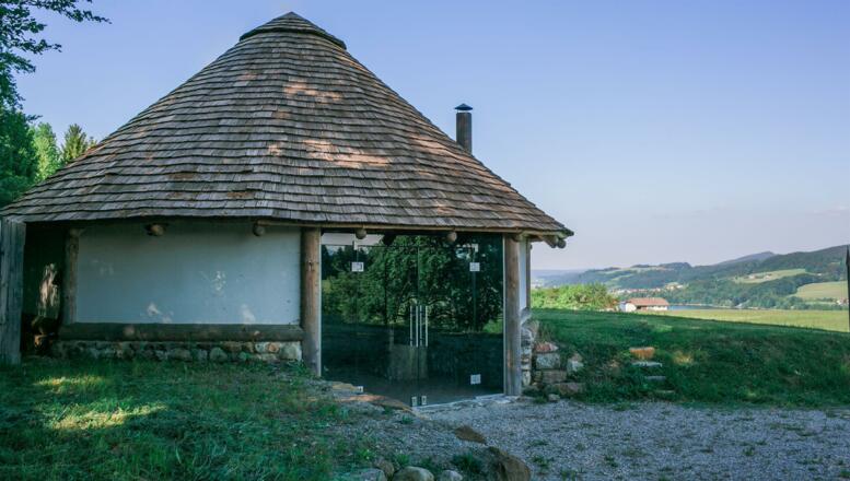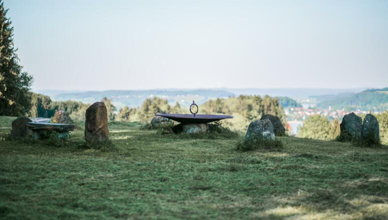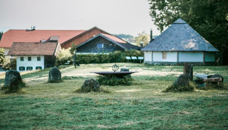 Die Keltenschmiede am Steinkreis mit der imposanten Feuerschale - vom mystisch-romantischen Teufelsgraben auftauchend genießen Sie die freie Sicht auf die Trumer Seen und bis zu über einhundert in der Sonne gleißenden Alpengipfel.