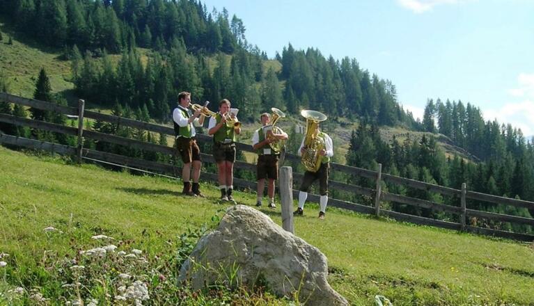 Auf den Almhütten aufgespielt wird von den: Bradlfettn, Budei Musi, Blaustutz Musi, Weisenbläser und Sänger.