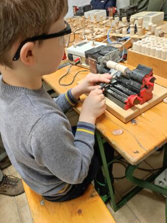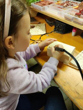 Unsere Kleinen Gäste dürfen sich in der KinderKreativWerkstatt künstlerisch betätigen und ihr Geschick beim Drechseln und Holzbrennen beweisen.
