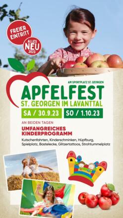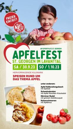 Jedes Jahr steht in St. Georgen Ende September der Apfel im Mittelpunkt. Tradition, Gesundheit, Kulinarik rund um den Apfel, musikalische Umrahmung und Kinderprogramm macchen dieses Familienfest zum Erlebnis. Das Apfelfest ist außerdem der größte Kärntner Apfelmarkt
